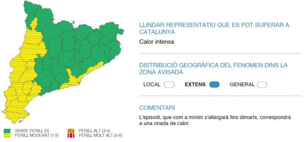 L’Hospital Santa Creu de Jesús informa que, segons el Servei Meteorològic de Catalunya (SMC), les comarques del Baix Ebre, Montsià, Terra Alta i Ribera d’Ebre es troben actualment en un nivell de 2 sobre 6, amb una probabilitat d’entre el 30% i el 70% de registrar temperatures especialment elevades durant els pròxims dies.