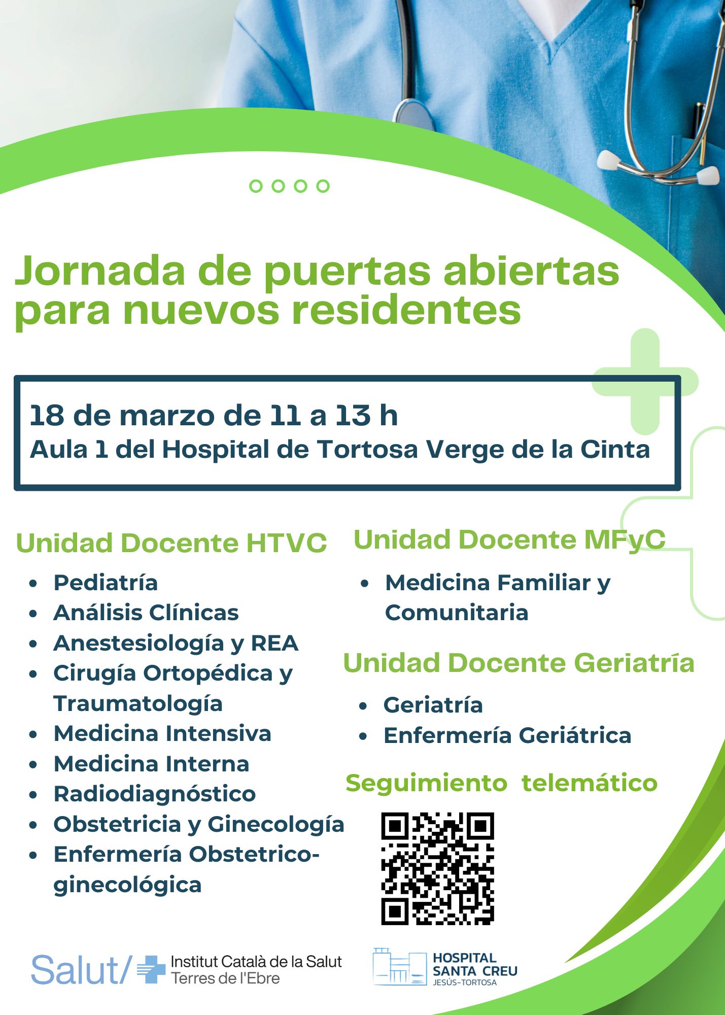 L’Hospital de la Santa Creu de Jesús-Tortosa (HSCT) aposta per una formació continuada de qualitat, tant dels/les professionals del centre com dels/les infermeres/es interns/es residents (IIR) i dels metges/ses interns/es residents (MIR) en l’especialitat de geriatria. D’aquesta manera, es vol potenciar la docència pregrau i postgrau en disciplines relacionades amb les ciències de la salut, això com la recerca per poder fomentar el treball en equip interdisciplinari i avançar cap a un model d’atenció centrat en la persona.