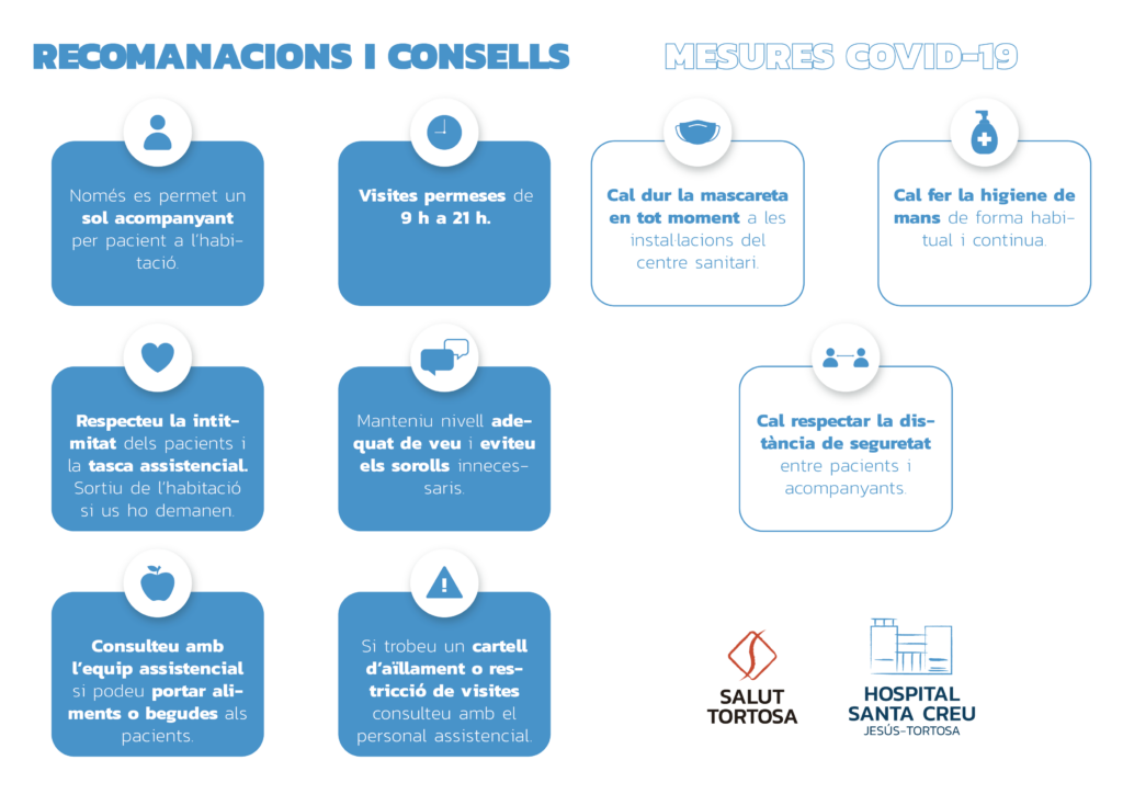 Per tal d’evitar contagis i vetllar per la salut de els persones ingressades, els visitants i acompanyants hauran d’acomplir unes mesures sanitàries. En aquest sentit, a les instal·lacions d’aquest centre sanitari caldrà dur la mascareta en tot moment. Així mateix, la higiene de mans és durà de forma habitual i continua. Finalment, caldrà respectar la distància de seguretat entre els pacients i els acompanyants.